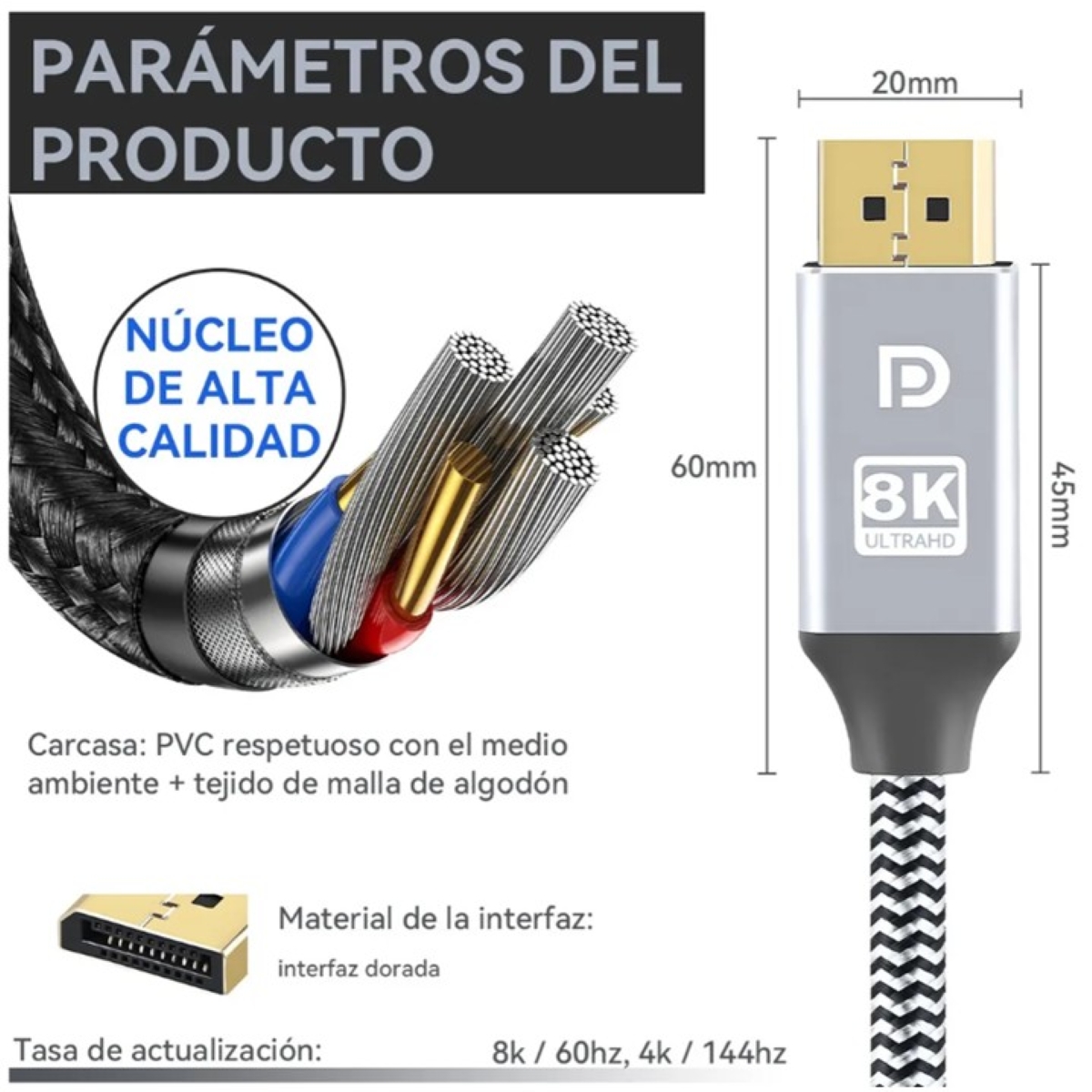 Conecta equipos a pantallas con velocidad de hasta 32,4 Gbps, frecuencia de actualización de hasta 8K 120Hz, 4K 144Hz, 2K 165Hz, resolución hasta 8K 7680x4320 calidad de imagen clara hasta en aplicaciones 3D Cobre estañado de 30 AWG y blindaje triple para resistir interferencias 200 cm longitud precio 169.00 MXN Envío San Luis RC MX:Sonora:Ground:20.00 MXN