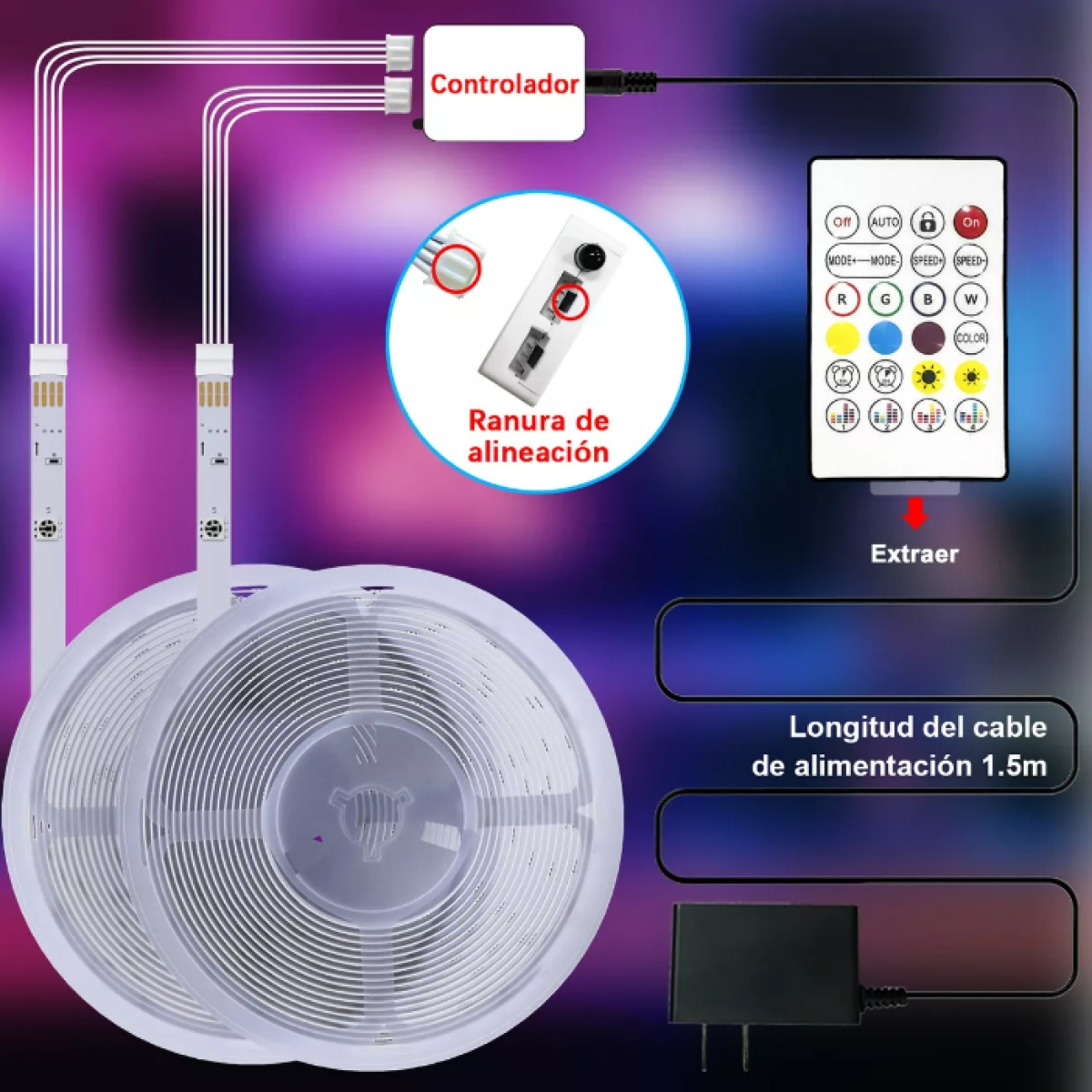 30 metros 2 tiras de 15 Con adhesivo controlador en medio, control remoto, también puede instalar una de las aplicaciones de voz en su celular configurar wifi 2.4 y seleccionar modos, configura colores personalizados, prende, apaga, brillo, parpadeo, rápido, salto, desvanecimiento, ritmo de audio precio 359.00 MXN sin costo envío San Luis RC