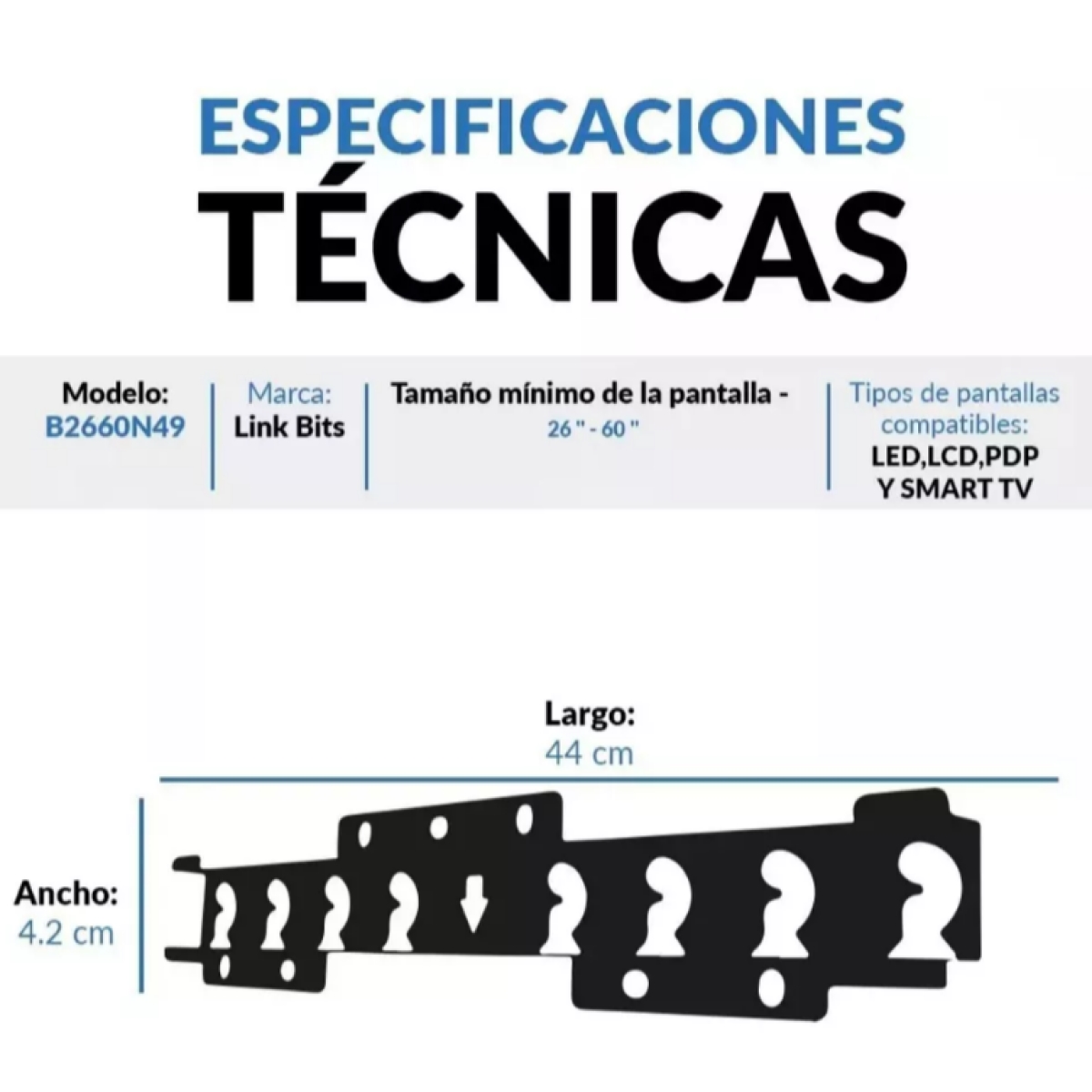 Para montaje fijo en la pared de Televisores, Monitores, pantallas LED, LCD, y Smart de 26 a 60 pulgadas con un peso máximo de 25 kilos cumple con el estándar VESA marca, Incluye tornillería para instalación precio 159.00 MXN Envío San Luis RC MX:Sonora:Ground:20.00 MXN